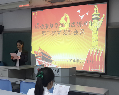 2014年6月17日下午4点,运动康复系2013级研究生党支部在教学楼406教室召开关于张灵婕、李晓彤、薛念华3名预备党员的转正大会。辅导员杨之慧老师、全体党员及入党积极分子参加大会。支部书记杜欣芮主持会议。